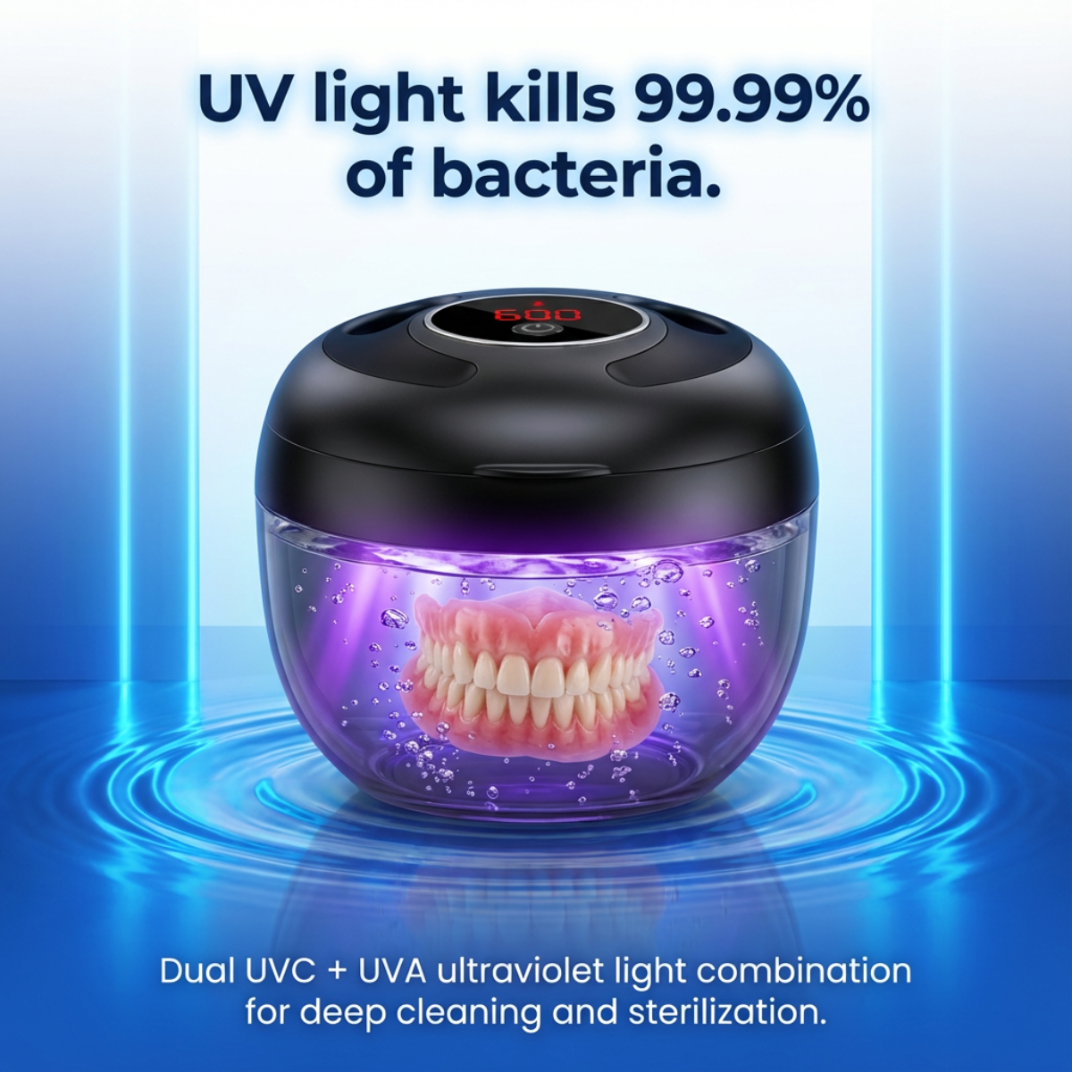 UV-C Sanitization: After ultrasonic cleaning removes physical debris, UV-C light (260-280nm wavelength) kills 99.99% of remaining bacteria, viruses, and microorganisms by destroying their DNA. This dual-action ensures not just clean, but truly sanitized retainers.